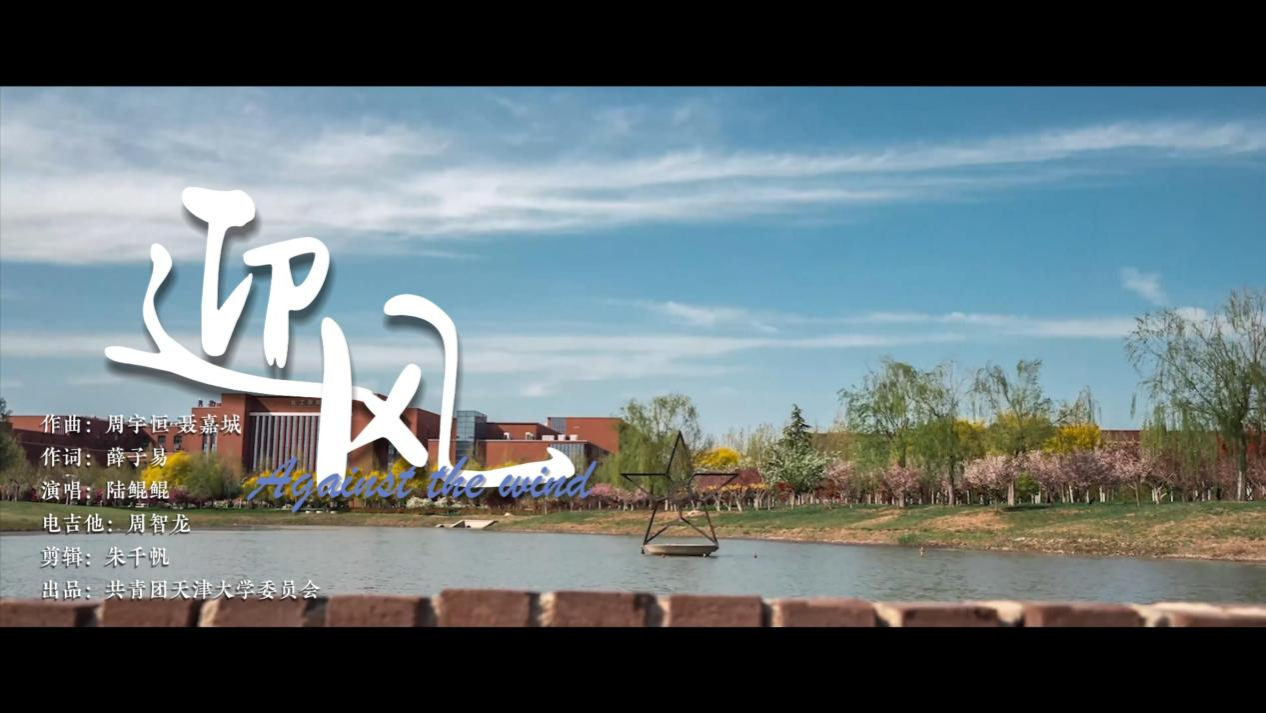 迎风,象征着天大青年青春蓬勃、奋勇向前的姿态。这首歌的前半段是民谣风格,木吉他+电风琴伴奏,营造出一种唯美的氛围;间奏是一段电钢琴演奏的《小星星》(象征星星之火可以燎原),鼓组加入,推动整首曲子的情绪;后半段是流行摇滚乐,进行曲风格。在与前半段相同的和弦和旋律的基础上,加入了以电吉他和电钢琴为主的伴奏声部,使得整首曲子的织体更加丰满,在行进的跳跃鼓点中把整首歌推向高潮——迎风而上,相遇高峰。