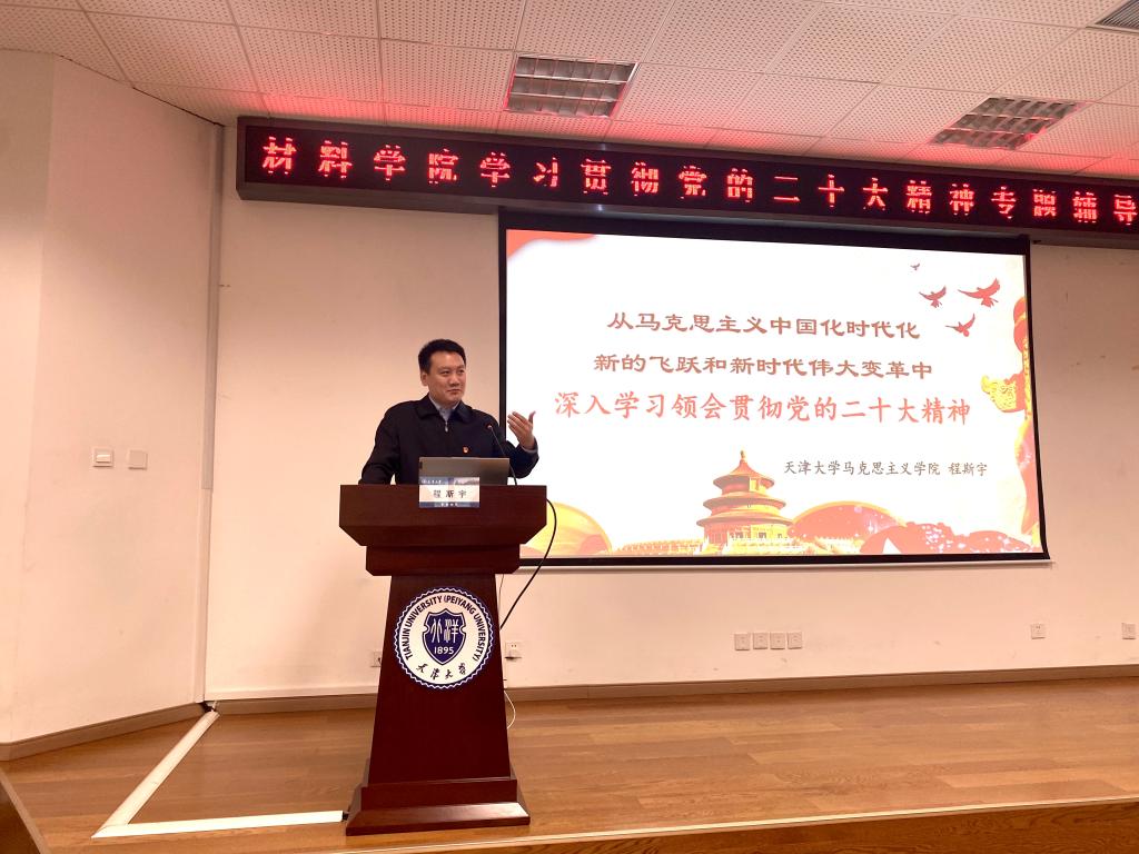 本站讯(材料学院供稿)为落实学校关于深入学习宣传贯彻党的二十大精神的要求,切实把思想和行动统一到党的二十大精神上来,10月28日上午,材料学院党委邀请马克思主义学院程斯宇老师就学习党的二十大精神作专题辅导报告,学院教工和学生党员代表聆听了报告。报告会由材料学院党委副书记王颖主持。