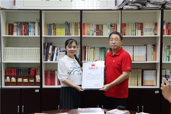 丁晓玲代表老同志们感谢出版社党总支积极为老同志办实事的暖心举措。今年是中国共产党建党百年华诞,全党开展党史学习教育。出版社党总支聚焦老同志的特点和需求,为老同志办实事,从今年开始,每年都会精心挑选适合老同志的书籍,捐赠给老同志们,丰富老同志的文化生活。特别感谢出版社党总支这一关心关爱老同志们的长效机制,离退休工作处将充分利用好这些书籍,丰富老同志们的精神文化生活。随后,丁晓玲代表离退休工作处向出版社党总支赠送了捐赠证书。