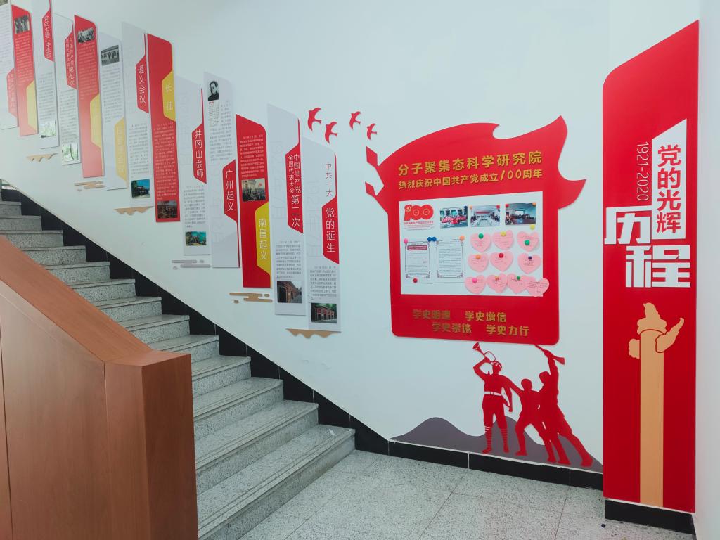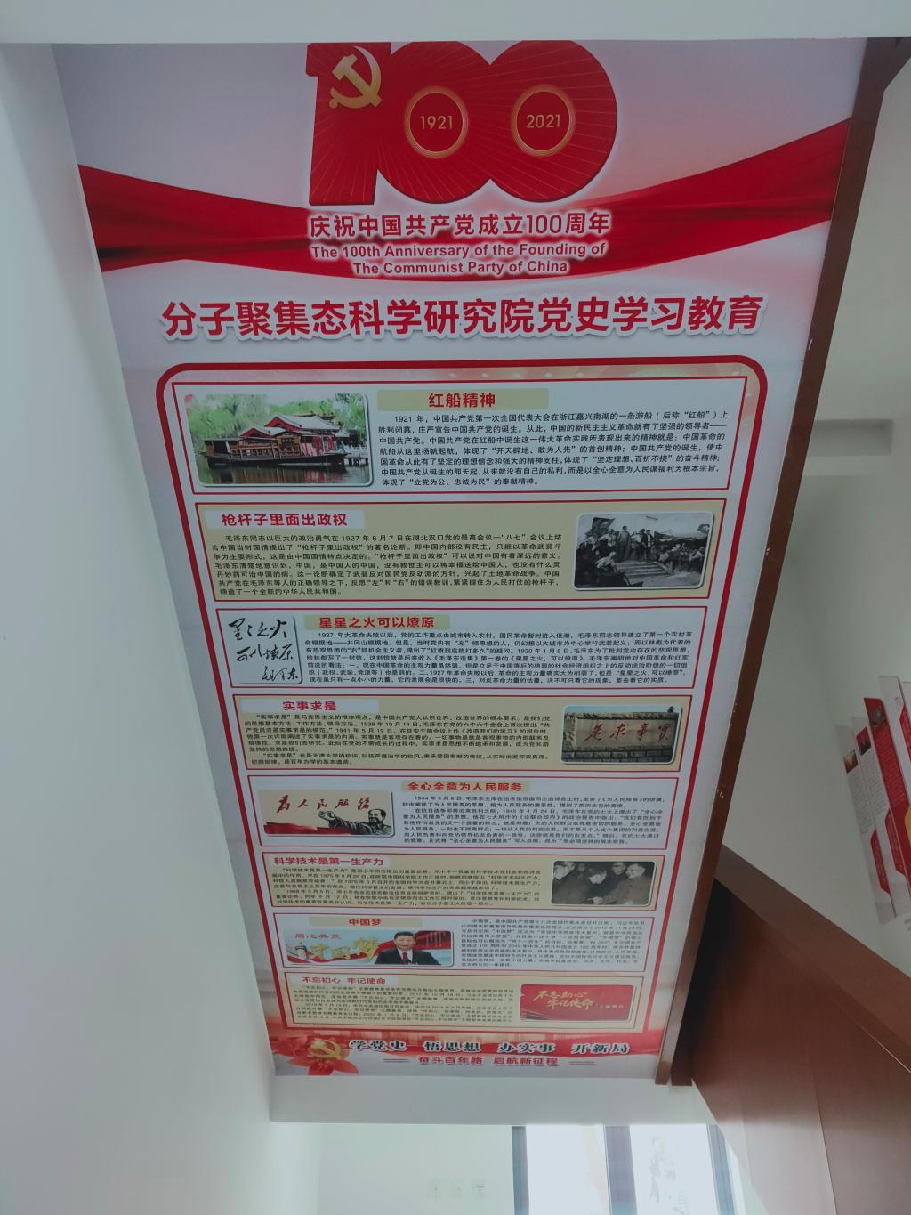 本站讯 为了深入开展党史学习教育,宣传党的百年光辉历史,弘扬传承党史精神,在全院范围内营造良好的党史学习氛围,分子聚集态科学研究院在院内公共空间开辟党史历程宣传展示区域,引导广大师生通过在日常学习工作中耳濡目染,以史为鉴,温故知新,坚定理想信念、提高党性修养。值此中国共产党成立一百年之际,献礼党的百年华诞。