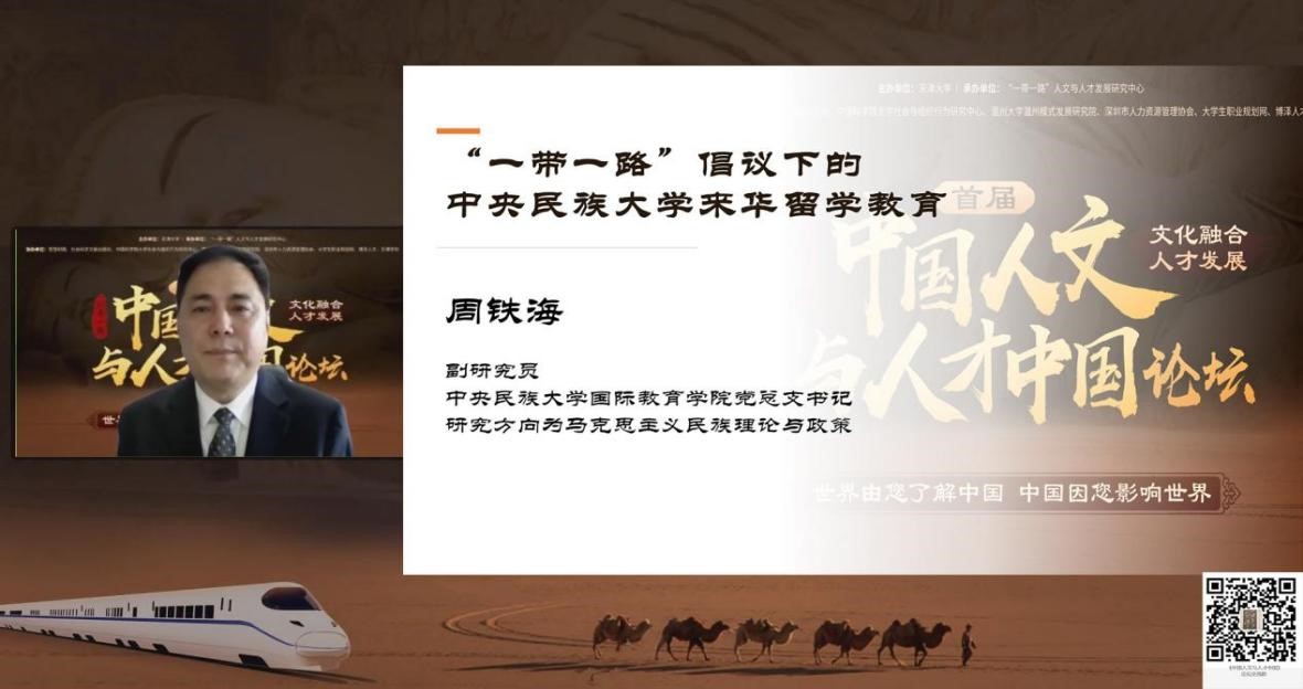 中央民族大学国际教育学院书记周铁海副研究员在主题报告中展示中央民族大学充分发挥学科专业的优势和特色,整合资源,构建了具有一定特色的“一带一路”沿线国家来华留学人才培养体系。