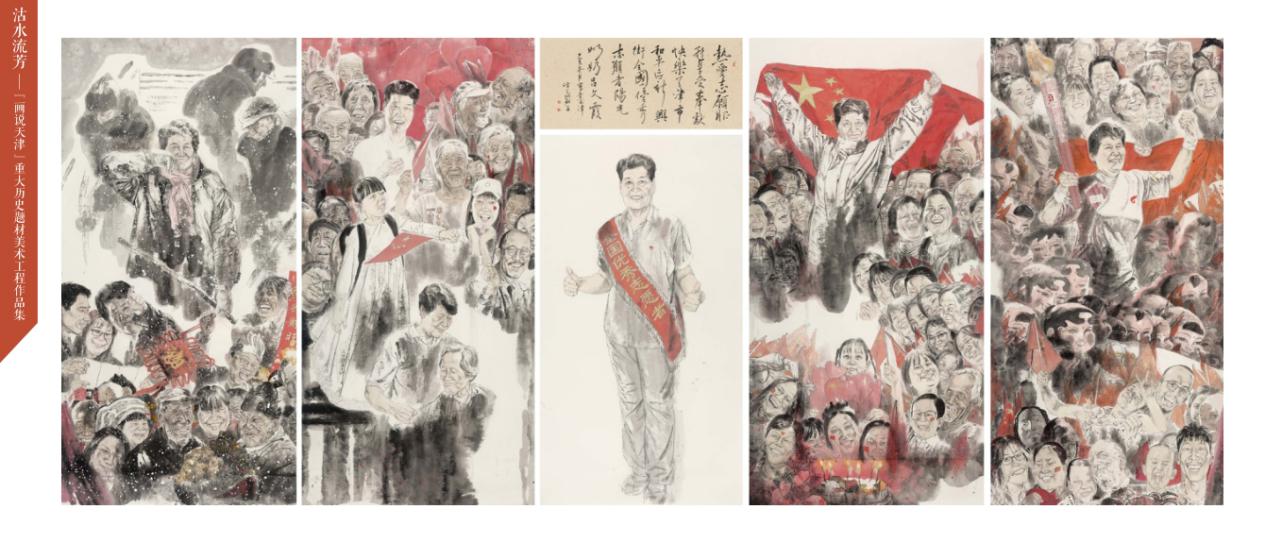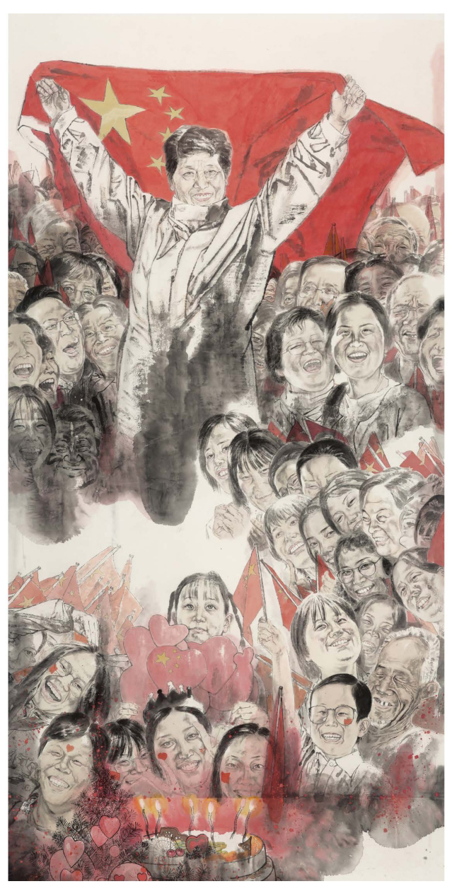 这幅巨幅中国人物画创作体现了诸多的中国画艺术特点。在造型上,用画笔将现实生活中真实存在的形象鲜活地表现出来。首先是在具象的要求下捕捉神情的鲜活,追求由形似走向神似;在构图上,追求构图的饱满性,形象近似真人大小的尺寸,使绘画形象产生扑面而来的视觉冲击力,营造出真实的绘画氛围,极大拉近了画作与观者之间的距离,使之尤如身临其境;在色彩上,在传统“墨”的基础上,大比重运用“中国红”。浓情明艳的红色永远是最完美的节日色,有一种仪式感,红红火火,它象征着幸福、喜庆、吉祥,传递着世间最美好的祝福。