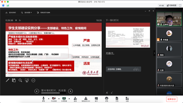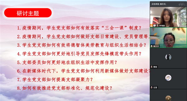 党支部书记的工作能力是学生党支部建设的保障。疫情期间,学生支部书记、支部委员在线上开展了以“提升学生党支部组织力,突出基层党组织政治功能”为主题的工作研讨会,结合疫情期间支部工作线上开展特点,探索工作新思路、新方法;利用线上组织生活开展特点,进行支部“云”共建,与华中科技大学环境学院党支部进行结对共建,分享抗疫期间学生党员的奋斗故事和科研初心,不断补充精神上的“钙”。