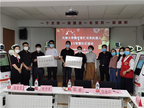 随后,焦璇为金狮家园社区、智慧未来科技有限公司授天津大学社会实践基地牌。社区工作者为求是学部学生党员孙雅正、姚晓雯讲解智能机器人的使用。