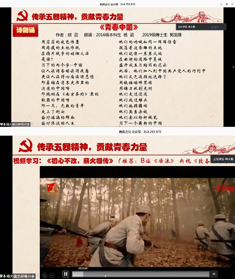 活动第一篇章是“传承五四精神、贡献青春力量”。支部副书记韩大量向与会人员介绍了五四精神的由来和深刻内涵。随后,通过重温习近平总书记《在纪念五四运动100周年大会上的讲话》和总书记八年来对青年人的寄语,进一步解读了五四精神的时代内涵,总结了五四精神与社会主义核心价值观一脉相承、同途同归的关系。之后,杨涵、郭龙缘两位同学深情朗诵了《青春中国》,全体成员一起观看了《初心不改·薪火相传》主题视频,进一步解读了五四精神在当今社会的深刻含义和现实意义。最后,借总书记对广大青年的寄语和问候,指出“青春由磨砺而出彩,人生因奋斗而升华”,只有继承和发扬五四精神,练就过硬本领,才能为新时代党和国家事业发展做出更大的贡献,坚定了全体成员将个人理想融入到社会进步和国家建设的潮流当中,为国家富强、民族振兴、人民幸福而奋斗的理想。