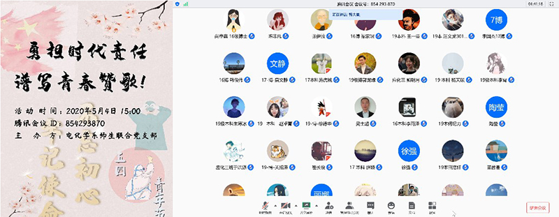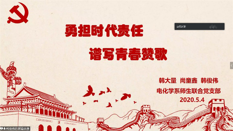本站讯(通讯员 李莎)5月4日下午,化工学院电化学系师生联合党支部举办了“勇担时代责任·谱写青春赞歌”为主题的五四青年节党建活动。活动共分为三大篇章,电化学系50余名师生共同解读了五四精神以及新时代中国青年的使命与担当,并且同步开展了疫情防控措施线上学习,落实安全复课开学的准备工作。