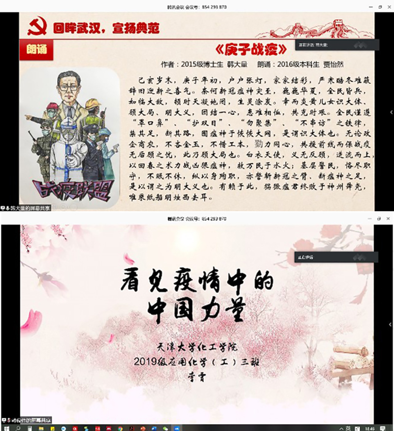 活动第二篇章是“回眸武汉、宣扬典范”。通过对新冠疫情期间涌现出的各种先进事迹、优秀人物的回顾和分享,充分解读了五四精神的时代特征。李霄同学《看见疫情中的中国力量》主题演讲,完美诠释了什么是中国力量;贾怡然同学《庚子战疫》主题朗诵,形象描摹出了什么是全民战疫;高嘉辰、唐文静同学的温情分享,深刻刻画出了国人先国后家的奉献精神。最美姑娘朱海秀、铁娘子魏捷、北京大学援鄂医疗队、天大人的战疫故事,无不体现着当代青年的责任担当,践行着五四精神的核心内涵。此次全民战疫,无论是奋斗在一线的白衣天使,还是在各个岗位上的工作人员,甚至是自觉接受隔离的全体民众,每一个人、每一件事都在用最真实的行动践行着华夏儿女的爱国主义,诠释着五四精神的时代内涵。