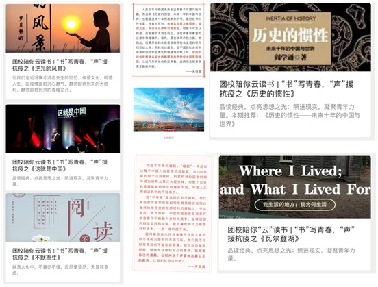 为引导学生多读书、读好书、读经典,深入探索研究创新,不断提升思想修养和科学人文素质,校团委依托线上媒体,创新活动形式,拓展学生沟通渠道。发挥品牌效应,开设“团校陪你云读书—‘书’写青春,‘声’援抗疫”专题栏目,于每周五与大家分享一本主题好书,针对书中热点话题,利用栏目加强与读者的互动。碰撞思想火花,开展线上读书分享会,组织不同学科学员5人组成读书小组开展读书活动,发挥学科思维方式差异化优势,倡导朋辈教育模式,实现对团校学员的思想引领。丰富展现形式,鼓励学生利用特长,通过制作图书海报、担任朗读者、分享配音秀等方式展现读书成果,将读书成果辐射得更广。倡导阅读新风尚,以世界阅读日为契机,开展“书行万里”活动,通过搜集读者信息,汇集成书籍地图,让学生开展一场精神旅行,在书籍的海洋中遨游。