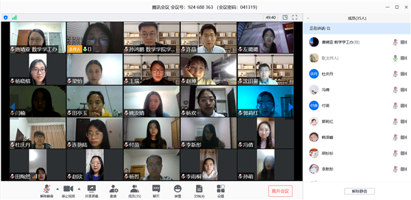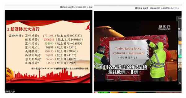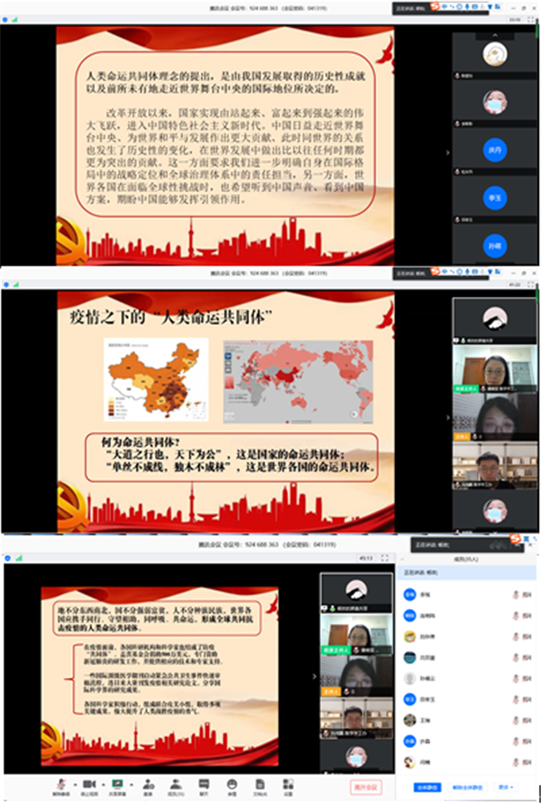 本站讯(通讯员 韩梅)4月13日晚,天津大学数学学院应用数学中心学生党支部召开线上组织生活,本次组织生活除党支部成员外,还邀请到学院党委副书记许晶、研究生辅导员唐婧亚、学生党建指导教师孙鸿鹏与同志们共同交流。经过支委策划,组织生活围绕线上讲解、讨论分享、总结升华三个环节开展,支部党员们全员相聚“云端”,共同学习和探讨“人类命运共同体”理念。