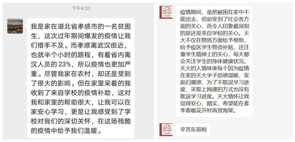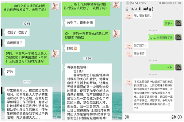 本站讯 (通讯员 王茜)新冠肺炎疫情牵动人心,天津大学深入贯彻习近平总书记重要指示精神,落实中央应对疫情工作领导小组会议部署。自疫情发生以来,天津大学高度重视并扎实做好疫情防控期间的学生资助工作,努力保障家庭经济困难学生的基本学习生活需求,为打赢疫情防控阻击战贡献天大力量。