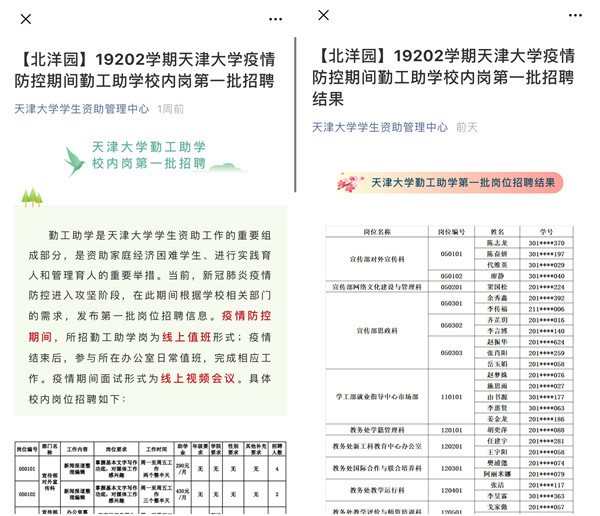 勤工助学,贴心上线。针对疫情期间工作方式的变化,设立疫情期间线上工作岗位,家庭经济困难学生优先申请。通过线上简历筛选、网络面试形式做好勤工助学岗位招聘工作。完成招聘后,指导学生助理根据各部门和学院的需求以线上工作模式开展工作,让家庭经济困难学生在疫情防控期间也能通过参加勤工助学,获得收入用于补贴学习和生活费用。