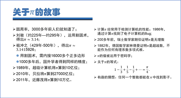 据悉,天津大学数学学院已连续两年开展“国际数学节”的庆祝活动,以青年教师报告、数学知识普及、朋辈沙龙交流、导师个性指导等四大模块为庆祝的主要内容。2020年“π Day”的云庆祝系列活动,通过活动宣传“π手称快”、竞赛信息汇总“一π即合”、线上交流报道“自成一π”,以及包括后续将要持续开展的专业教师“π忧解难”,形成覆盖本硕博全体学生的数学素养能力提升的“组合拳”,以期培养更多有志于从事基础数学、应用数学研究的未来高手,为国家经济、生物、化工、医学、智能计算、互联网、船舶等各个领域的发展贡献数学人的力量。