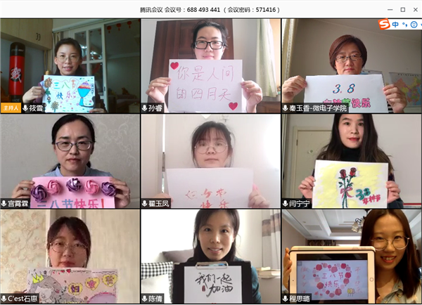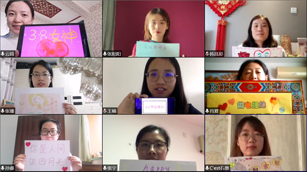 本站讯(通讯员 赵雪)2020年的“三八”国际妇女节翩然而至,由于当前国家正值新冠肺炎疫情防控关键时刻,为给全院女教工过一个既安全又有意义的节日,微电子学院工会依托互联网,于3月8日下午举办了线上庆祝活动,学院十七位女教工参加本次活动,活动由工会副主席肖夏老师主持。