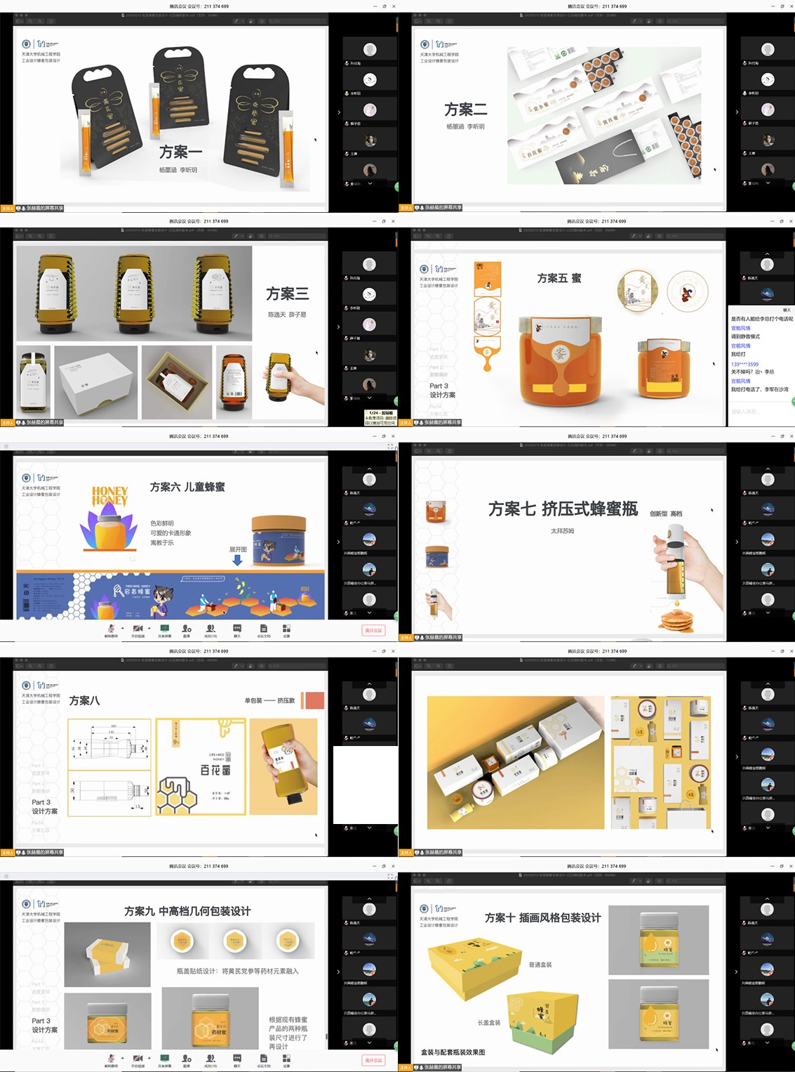 亥子交替的这个冬天,疫情带来了额外的寒冷,也为设计团队的计划增添了难以预料的变数。原定于2月中旬赴宕昌实地走访、与当地领导面对面汇报成果的计划转为“云端交谈”。在本次由张赫晨老师主持的汇报会议上,团队中各小组同学对所设计的方案进行了简要汇报。风格各异的蜂蜜包装设计方案针对高中低三个档位,涵盖平面设计、内外包装结构设计等大量专业内容。汇报得到在线的宕昌县领导贾爱会部长、唐春梅部长、何立乾副书记、蜂蜜厂蔡鹏辉总经理等的真诚感谢和肯定。同时,他们希望设计小组掌握更多关于宕昌文化以及宕昌蜂蜜产业现状的信息,让下一步的设计方案更聚焦。邢元老师也提出了大量促进设计产品落地的具体意见和建议,希望设计团队后续和宕昌县紧密沟通交流,为设计的最终落地而共同努力。