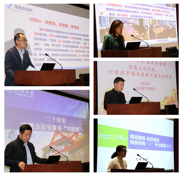 本站讯(通讯员 付永兴)为进一步推动“不忘初心、牢记使命”主题教育落实落地,充分展示主题教育期间机关部门整改成果,提升机关干部服务意识和服务能力,推动机关部门不断改进工作作风,12月6日上午,机关党委在北洋园校区行政楼A102报告厅组织机关部门开展“改进作风、服务基层”优秀案例评选暨整改成果交流会。会议由机关党委常务副书记张文礼主持,学校主题教育第五指导组组长程文生,部分机关党委委员、机关各党支部书记或委员、院级单位代表、机关科级管理干部代表、学生代表等参加会议。