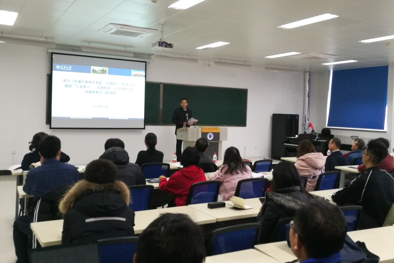 本站讯(通讯员 王慧)按照学校统一部署和要求,进一步推动“三全育人”“五育并举”人才培养综合改革,12月6日上午精仪学院和药学院联合开展“三全育人”“五育并举”宣讲会。天津大学校长助理肖松山应邀作专题宣讲报告,药学院党委书记冯翠玲、精仪学院党委书记王海龙及两院师生代表100余人参会。