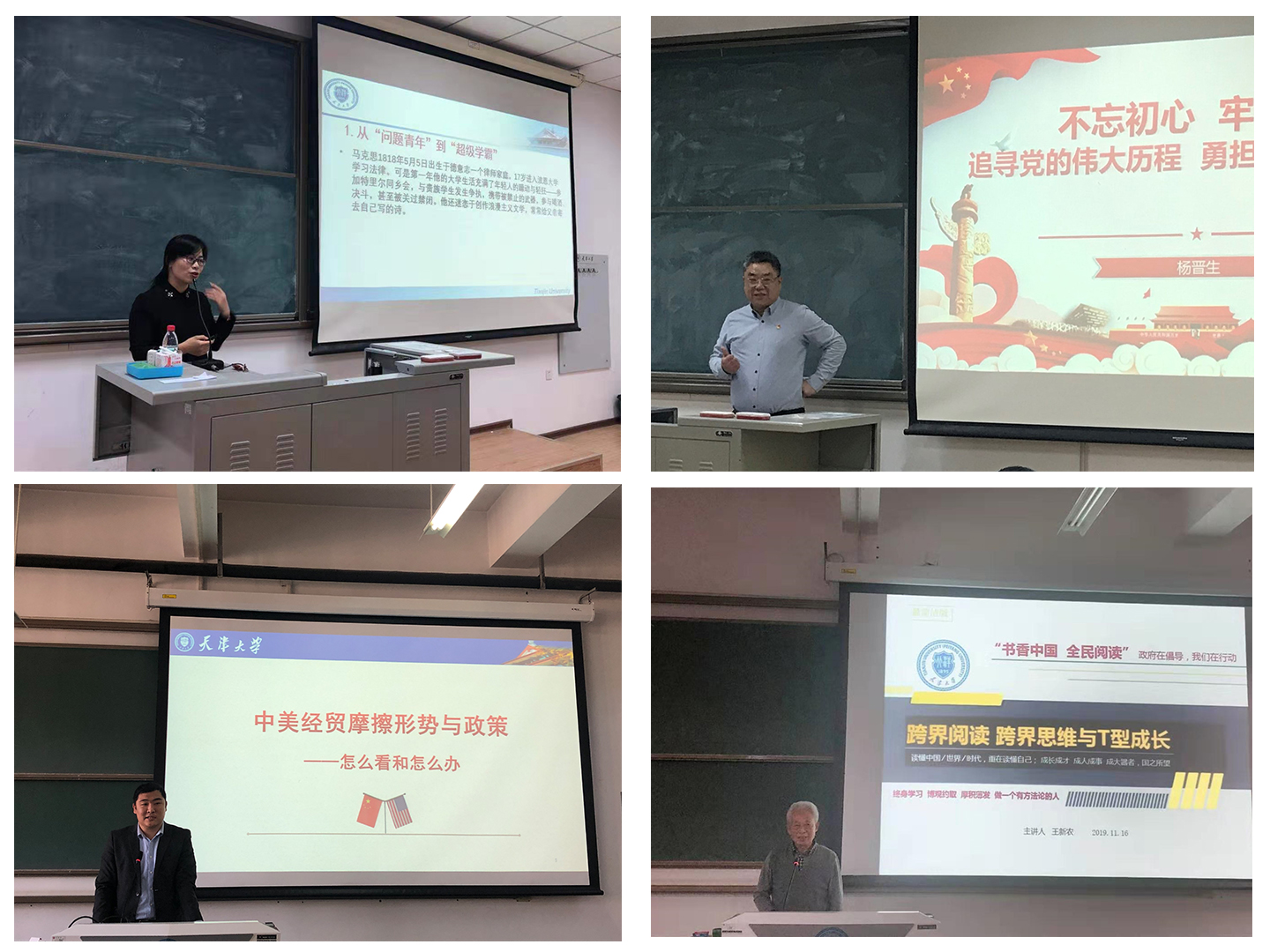 11月3日上午,屈婷在12教401为党员们讲授第一节专题党课——“为什么信仰马克思主义“。屈婷老师通过马克思的生平结合中国特色社会主义理论,开阔了同学的视野,帮助大家更好的理解了中国特色社会主义理论。11月3日下午在12教401,杨晋生为学生党员讲授第二节专题党课——“追寻党的伟大历程,勇担新时代青年的责任”,杨书记回溯中国共产党的伟大历史,通过党的指导思想的不断丰富发展,结合今日之青年的责任与使命,生动的讲述了一个新时代青年应该有的胸怀与视野,让同学们对党的指导思想和党的伟大历史有了更深入的了解。11月10日下午在26教A409,韩旭为学生党员讲授第三堂专题党课——“形势与政策:中美贸易摩擦”。韩旭老师以精准的话语向同学们剖析了中美大国关系的前世今生,让同学们更深入的理解了中美贸易摩擦的原因、经过与影响,使得学生党员在国际形势中深刻理解青年学子的责任担当。11月16日上午,王新农老师在26教A103为本期党员集中理论培训讲授最后一堂专题党课——“结合天大品格谈跨界阅读、跨界思维、跨界成长”。王新农强调跨界阅读跨界思维的重要性,并结合天大品格,引导广大学生党员要学会用科学武装头脑,用人文滋养心灵,为学生党员们在接下来的学习科研与成长成才指引了方向。