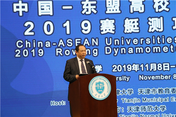 巩金龙代表天津大学致辞,对各位来宾的到来表示诚挚的欢迎与衷心的感谢。他认为,在中华人民共和国成立70周年、中国东盟建立战略伙伴关系16周年这一友好节点,大家齐聚天大开展赛艇运动交流活动,不仅是庆祝与纪念,更是表达了我们携手走向美好未来的愿景。巩金龙表示,天津大学会在“一带一路”倡议的指引下,继续发挥中国-东盟智慧海洋中心载体作用,为中国和东盟高校间的合作交流提供更多更好更务实的平台;同时也会以体育文化交流为契机,继续推进天津大学和东盟高校在人才培养、科学研究、文化交流等方面的合作交流。