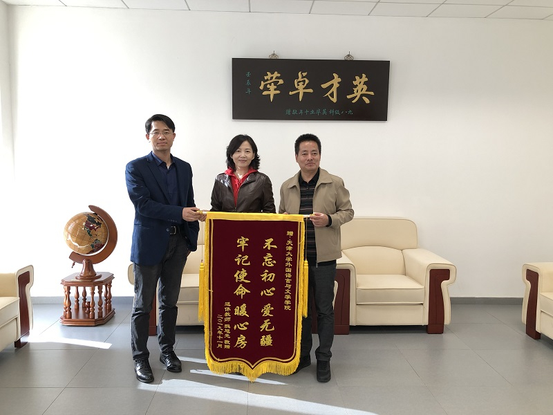 本站讯(外国语言与文学学院供稿)11月7日下午,外国语言与文学学院退休教师魏旭光委托女儿向学院党委送来一面锦旗,锦旗上写道:“不忘初心 爱无疆,牢记使命 暖心房”。家属激动地对学院领导说:“感谢学院党委对老同志们的关心关爱,我们家属内心十分感动,今天送来锦旗,表示我们心中诚挚的谢意。”