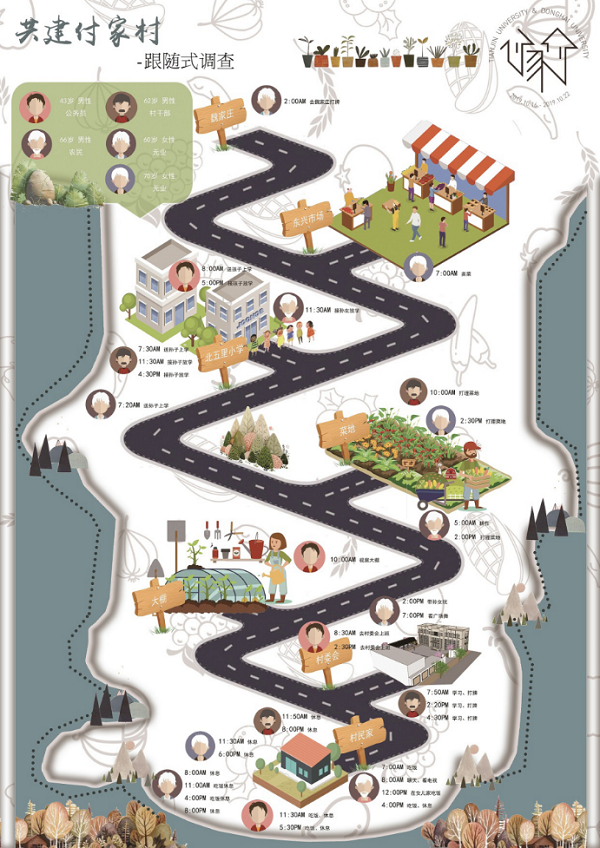项目组对付家村展开深入的调研,并对村民进行了口述史记录、全日观察等基础工作,对付家村的发展历程、村民记忆、民俗特色、农耕文化、日常生活等方面进行了考察。收集了村民保留的老物件。对村内典型人群进行了全天跟踪式调查,掌握村民日常生活的路线和相关信息。