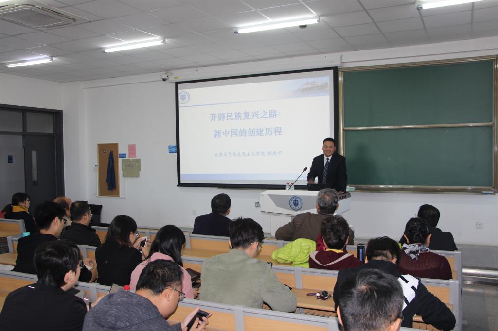 本站讯(通讯员 王慧)10月25日下午,精仪学院党委在23楼512室举办“不忘初心、牢记使命”主题教育辅导报告,马克思主义学院教师程斯宇应邀作题为《开辟民族复兴之路:新中国的创建历程》的精彩报告。学院党政班子、各系负责人、在职教工党员、离退休党员代表、学生党员代表等200余人共同参加。