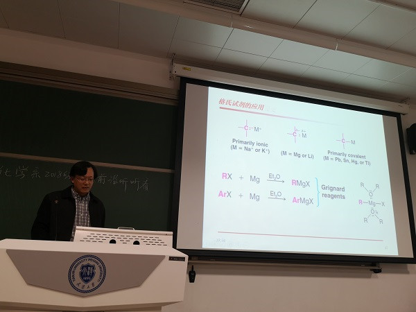 紧接着王光伟为大家介绍了金属有机化学的相关发展。从金属有机物的化合物各方面性质、金属有机化学的发展史以及该研究方向上历年的诺贝尔化学奖获得者的相关研究进行了大致的介绍,带领同学们在短时间内了解到金属有机化学领域的相关信息及未来发展方向。