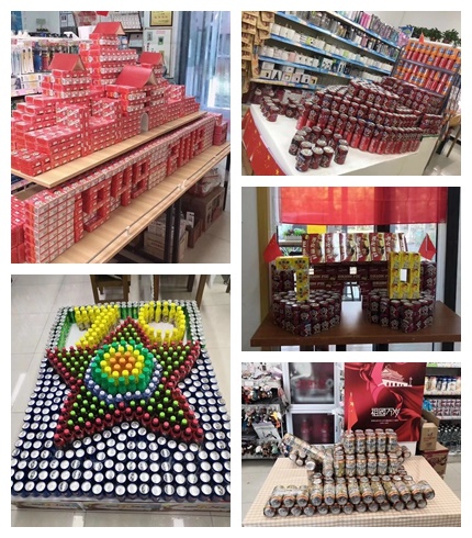 建功新时代、技能比赛比的是真本领真技能。各超市群策群力,使用最少的商品,以精湛的陈列技术、奇妙的构思、精美的作品向祖国告白,祝福祖国永远繁荣昌盛。本次比赛共9个超市参赛,陈列的造型主要有中式古典城楼、巨轮、天安门、坦克、爱心、五角星、“中国”和“70”字样,一个个构思新颖的形状、积极向上的主题、搭配美观的图形让评委们眼前一亮,纷纷赞不绝口。比赛最后是食悦書香餐厅的创意摆台展示。