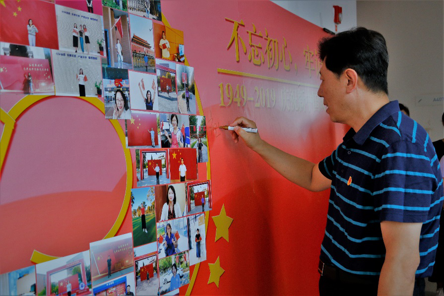 紧接着,大家前往“庆祝新中国成立70周年——我和国旗同框”主题照片墙。大家把自己与国旗的合照粘贴成“70”的样式,并纷纷留下对祖国的祝福。歌颂新时代,唱响主旋律,弘扬正能量,一份份饱含深情的祝福,表达了我们对祖国的无限热爱。