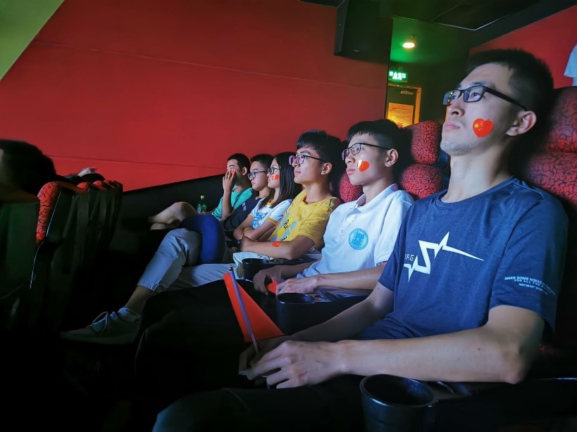 该片讲述了新中国成立70年间普通百姓与共和国息息相关的故事。一个个鲜活生动的普通人的奋斗故事,无数个历史性经典瞬间,让观影的学子沉浸其中,随着剧情的起承转合,时而因时代英雄们为祖国科技事业发展做出的贡献和牺牲而感动落泪,时而为女排精神、香港回归而备受鼓舞,振臂高呼,爱国之情油然而生,家国情怀矢志不渝。同学们将国旗握在手中,贴在脸上,捧在心中,影片高潮处,同学们不禁挥动手中国旗,鼓掌相合。当《我和我的祖国》片尾曲响起,全体学生自发起立,共同高歌,优美旋律响彻全场,共同祝愿祖国繁荣昌盛!