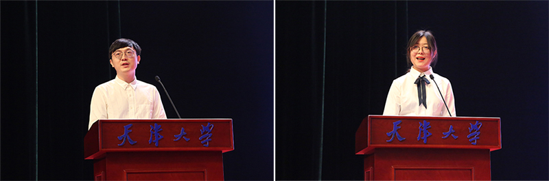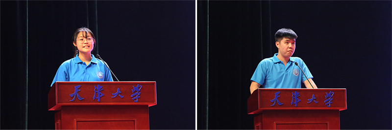 院学生会主席、2017级过控甲班宁静代表在校本科生发言。她鼓励大家“求真务实担大任”,珍惜自己人生中最为宝贵的四年时光,担起属于天大化工学子的历史责任。