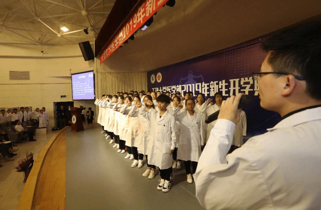新生代表自顾晓松院士手中郑重地接过白袍。同学们全体起立,握紧右拳向自己许下庄严而神圣的承诺《医学生誓言》。“健康所系,性命相托”,医学部学子齐声宣誓,立志以全心全意助力健康中国建设为己任,崇尚医德,不负韶华。