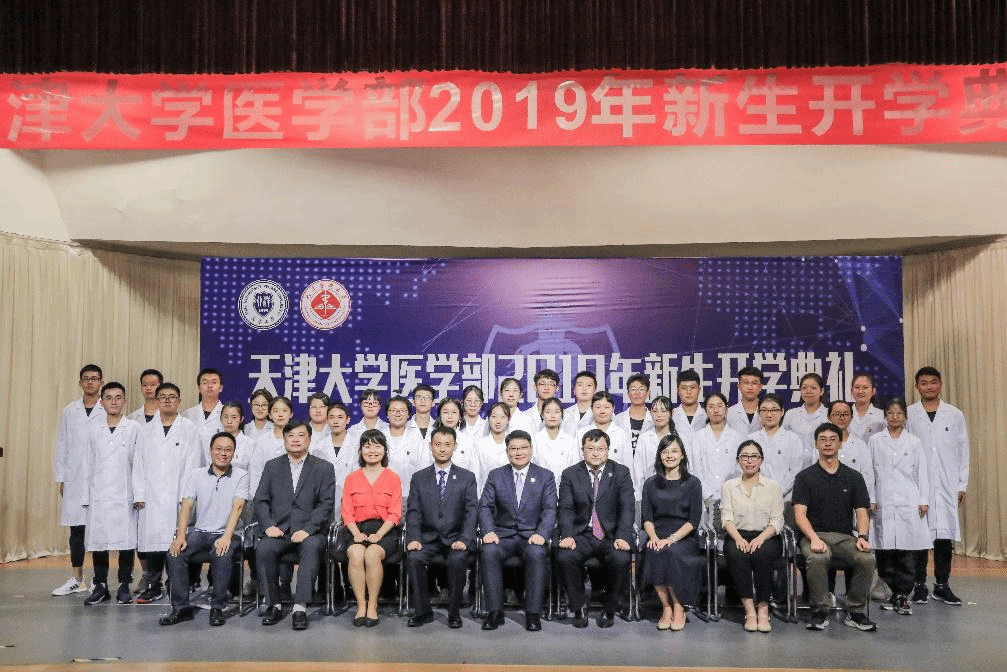 天津市卫生健康委员会科教处处长高辉,中国工程院院士、天津大学医学部主任顾晓松,天津大学党委副书记、组织部长、统战部长赵美蓉,天津医科大学副校长于春水,天津天堰科技股份有限公司董事长刘霄飞,天津大学六家附属医院相关负责领导,天津医科大学教务处、生物医学工程与技术学院,以及天津大学医科建设办公室、医学部负责同志出席开学典礼,共同迎接来自天津大学医学部、天津医科大学生物医学工程与技术学院共200余名2019级新生。