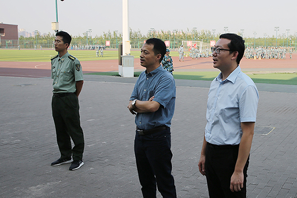本站讯(通讯员 李莎)9月3日,化工学院党委书记赵金铎、党委副书记高旭东赴田径场看望大二军训学生,2018级辅导员董严斌、赖伊璠陪同。