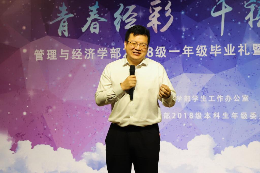本站讯(通讯员 任怡璇 赵博洋 范宁)6月2日,“青春经彩,千禧相约”——管理与经济学部2018级一年级毕业礼暨班主任聘任仪式于卫津路校区大学生活动中心举行。往届业界导师代表1995级管理工程校友、正荣地产集团有限公司董事兼总裁、中国房地产协会副会长王本龙,2005级工业工程校友、中国国际金融股份有限公司债券基金经理毛毳;管理与经济学部主任霍宝锋,党委副书记李庚,部分系所党支部书记、系主任代表,各专业班主任及各年级辅导员应邀出席。