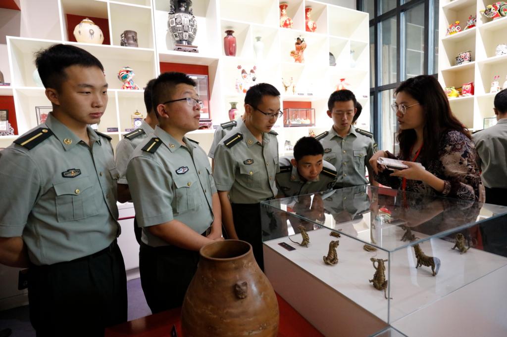 今年适逢新中国成立70周年与纪念五四运动100周年,借国家文化和自然遗产日之机,天津大学的50名国防生走进冯骥才文学艺术研究院跳龙门乡土艺术博物馆,不仅了解到发生在天津总商会的五四往事,更亲手碰触这两根染过革命志士鲜血的圆柱,这种难得的直接体验令他们激动不已,备受鼓舞。国防生们还参观了花样生活厅、雕塑厅和百花厅。 各个地方、民族老百姓一年到头的生活习俗,精美实用、饶富乡土韵味的生活用品,古代不同时期具有代表性的雕塑精品,现代民间艺术大师的杰出作品,都让国防生们沉浸在多元灿烂的乡土艺术中,对祖国的历史、传统和审美有了更深的体悟和情感。
