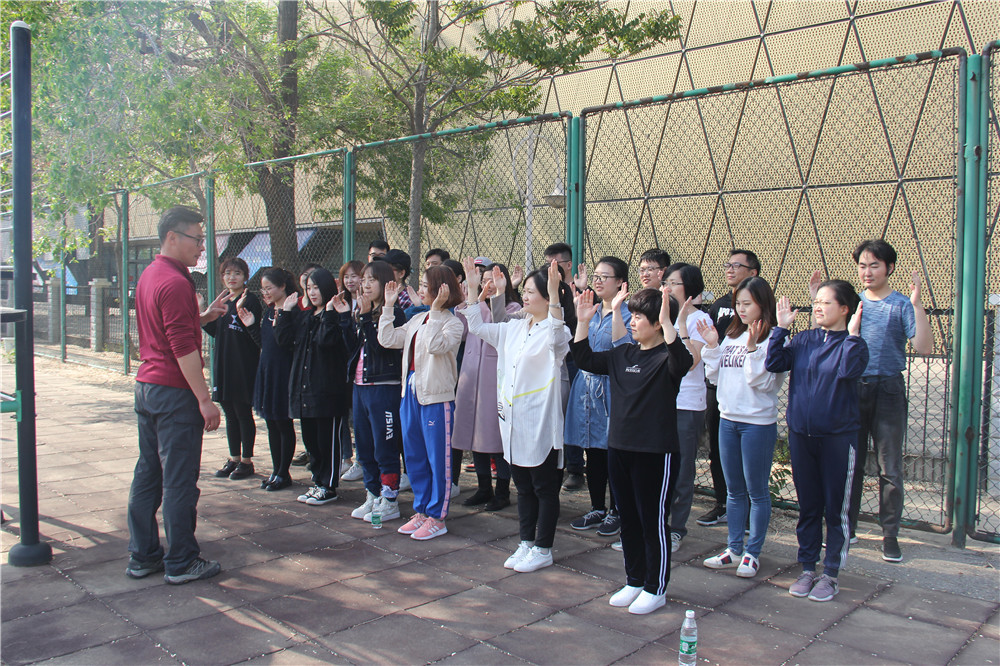 之后,青年教工来到天津大学体育馆集合参加团体辅导,在素拓师吴老师的带领下,进入热身环节,通过“老师说”“快速反应”等小项目,协调配合,提升队伍快速应变能力,不仅愉悦了身心,更增加了队伍的凝聚力,破冰游戏活跃了现场气氛。随后,队员们分为2个小队,每队为了一个共同的任务,集思广益编创了属于自己队伍的队名、logo、队歌、队型。并在之后的队伍展示中,向其他队的队友们介绍自己,加深了队员间的了解。团队成员团结一心、相互鼓励,最终全部完成任务。
