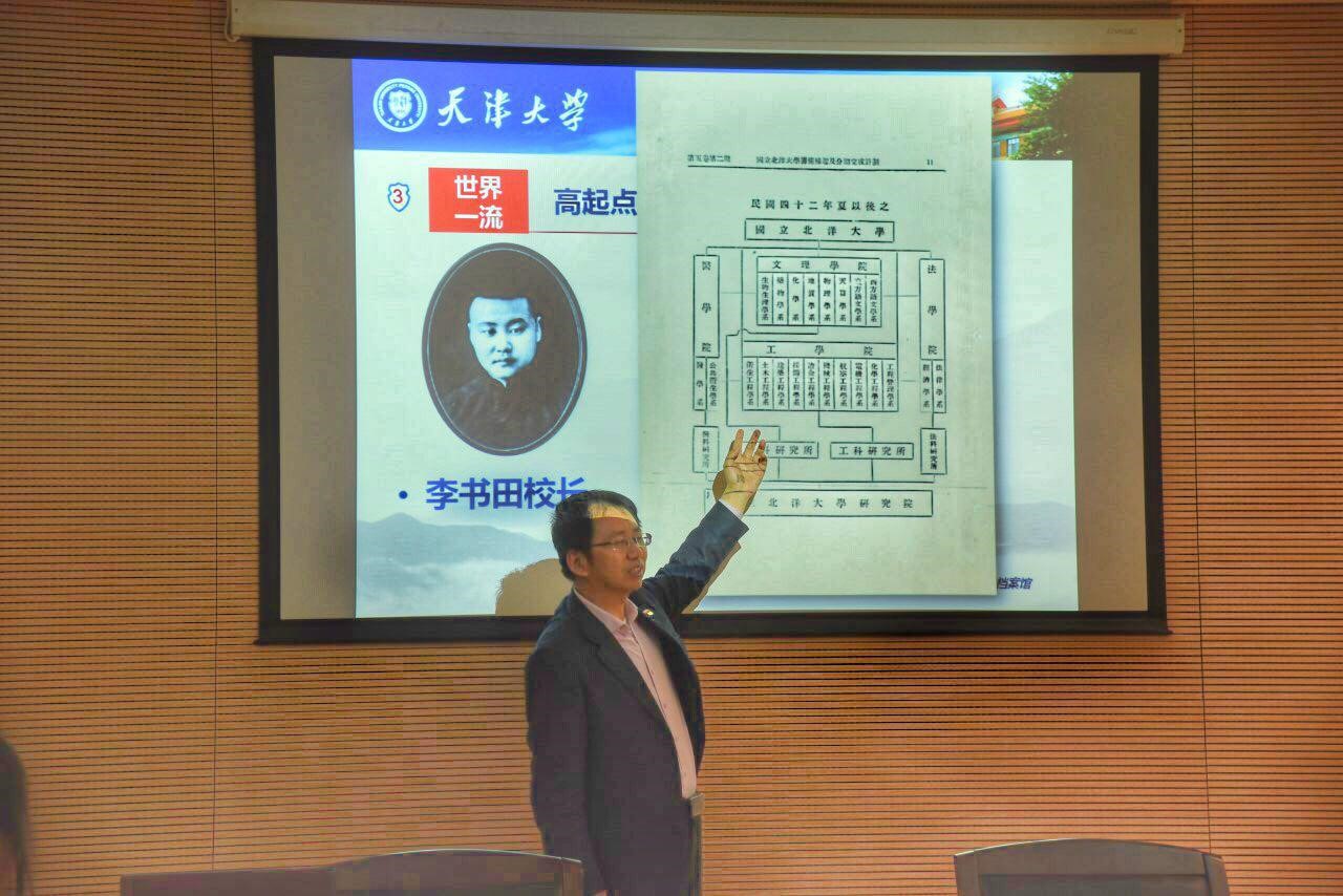 天津大学档案馆馆长韩宝志以《从校史发展看天大品格的形成》为题向党员同志们进行了精彩的讲解。通过将天津大学发展历史与中国近代历史的结合对比,生动地体现了天大自建校来始终以兴学强国为使命,将学校的事业发展融入到国家民族的命运和事业中。通过展示学校早期制度、学生作业等史料,体现了天大严与实的坚持、对世界一流大学目标的追求。实事求是的校训,严谨治学的校风,爱国奉献的传统,矢志创新的追求,这根植于天津大学的基因中。