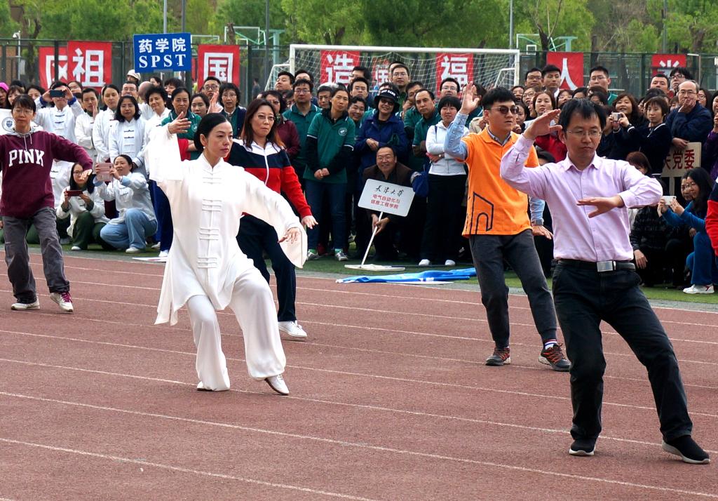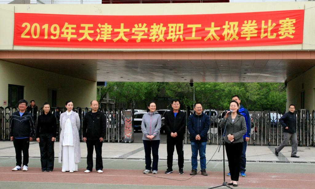 本站讯(通讯员 温锌勇 摄影 王训斋 方淮成)4月19日,天津大学教职工太极拳比赛在卫津路校区体育场举行。校党委副书记、工会主席、组织部长、统战部长赵美蓉,体育部党总支书记韩文俊、主任吴金克,校工会常务副主席马桂秋、副主席陈宝禄、挂职副主席姚卫东出席活动,来自全校30个院级工会的25支队伍共500余名教职工参加比赛。本次比赛特别邀请国家一级裁判员、公安前卫太极俱乐部主任董广福,国家一级裁判员、天津市第十四届运动会太极冠军赵志红,国家一级裁判员、天津大学副教授韩凤芝担任裁判。