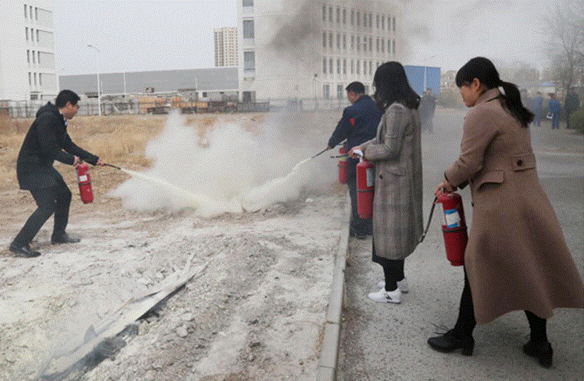 讲座结束后,随着消防演习总指挥薛家治按下火警手动报警器,消防应急广播随即开启,全体参演人员在急促的警报声中快速有序从3号楼二层撤离至楼前广场;模拟4号楼C区一层大厅木质家具起火,微型消防站接报后立即出动,利用楼内消防栓出枪并配合灭火器进行“灭火”演练;全体人员在专业指导下,认真学习使用消防器材,亲身感受灭火过程。