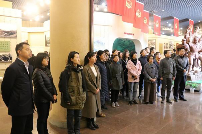 30日下午,参训同志来到盘山烈士陵园。化工学院、财务处、审计处分别为烈士纪念碑敬献花圈,大家集体默哀、重温入党誓词、瞻仰烈士纪念碑,并在烈士墓区和纪念碑廊前聆听先烈革命事迹。而后,参训同志参观盘山革命纪念馆,了解抗日战争年代盘山儿女前仆后继、保家卫国的不朽事迹。在纪念馆二层,83岁老人赵文德慷慨激昂地为大家讲述蓟州革命历史,他表示,我们不能忘记历史,要继续走完革命先烈未走完的路、继续做完革命先烈未做完的事业,用实际行动把红色基因一代代传下去。