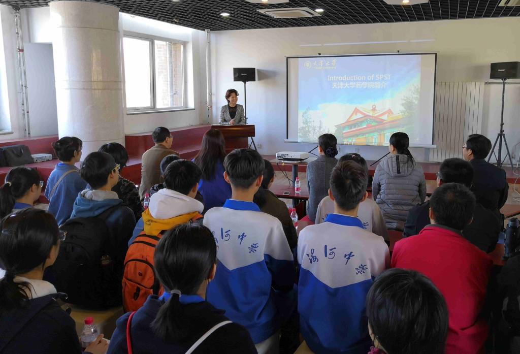 冯翠玲书记在致辞中表达了对海河中学到访师生的热烈欢迎,在介绍了张太雷、王宠惠、马寅初、徐志摩等天津大学杰出校友及药学院国际化建设取得若干重要成果后,冯书记鼓励同学们刻苦用功,努力学习,将来都能考上理想的大学。她告诫同学们一定要树立远大目标,将来步入社会后能够一展自身所学,为实现中华民族伟大复兴的中国梦做出贡献。