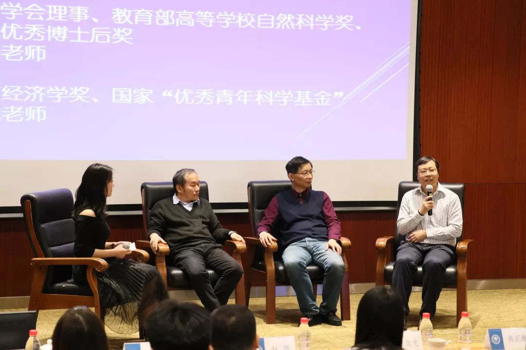 随后,吴奕飞、赵慧、刘志新三位青年教师向大家分享了他们学习数学的一些心得。吴奕飞老师认为学数学要有野心,并把野心转化为兴趣和动力,他鼓励高年级本科生可以多参加一些科研项目。赵慧老师列举了概率中的事件独立性,提到当一件事情成功的概率是1%,如果尝试500次,假设每个事件都是独立的,那么至少有一次成功的概率是99%,她借此鼓励同学们要勇敢尝试,努力学好数学。刘志新老师也提出学数学需要勤奋,他以射雕英雄传中大侠郭靖为例,提出学数学天赋固然重要,但勤奋更加重要。