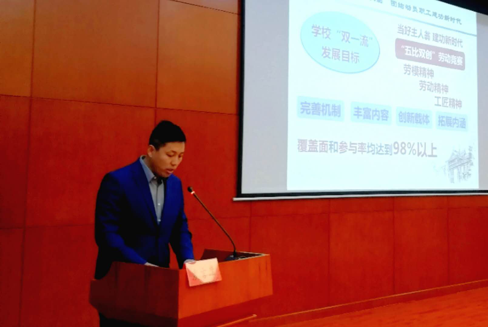 2018年,校工会牢牢把握为实现伟大复兴中国梦而奋斗的工人运动时代主题,以习近平新时代中国特色社会主义思想为指导,贯彻落实中国工会十七大精神,大力弘扬劳模精神、劳动精神和工匠精神,深入开展“当好主人翁、建功新时代”主题竞赛活动,形成了“党委统一领导、工会动员部署、基层组织实施、教职工广泛参与、学校选树表彰”的劳动竞赛领导体制和工作机制。一是党委重视、行政支持,以劳动竞赛推动群众性建功立业活动深入持久开展,拓宽领域、丰富内涵,激发教职工劳动创新活力。二是分类指导,重在实效,细化基层单位“五比双创”实施方案,教职工全员参与,发挥劳动模范群体的示范引领作用。三是拓展活动载体,组织开展八大系列劳动竞赛活动,形成了科学化、专业化、常态化的劳动竞赛活动机制。校工会围绕学校“双一流”和“十三五”建设目标,以“五比双创”劳动竞赛为先导,广泛开展群众性建功立业活动,凝聚新时代奋斗伟力,唱响新时代奋斗者之歌,推动学校事业发展再上新台阶。