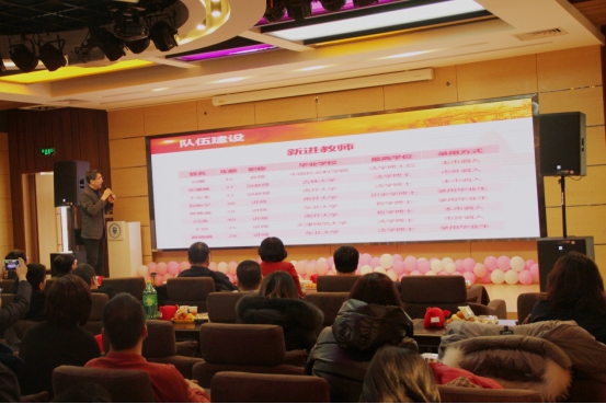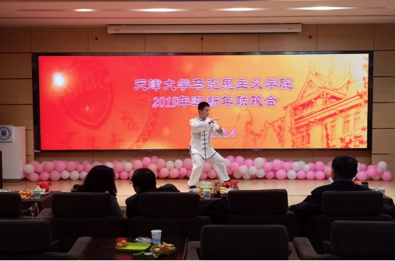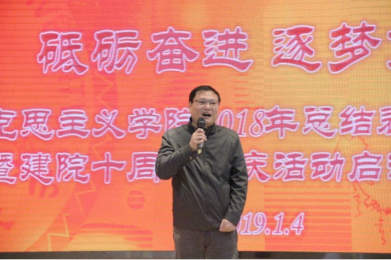 马克思主义学院党委书记徐斌首先对学院2018年工作进行了总结。他从党的建设、队伍建设、学科建设、人才培养、学术研究和理论宣传六个方面对学院工作做了回顾。他表示,2018年是马克思主义学院发展的一年,奋进的一年,对各位领导老师和同学们为学院做出的贡献表示衷心感谢。学院新加盟、新入职的教师们做了自我介绍,并表示,很庆幸与天大结缘,加入马院大家庭,新的一年会更加努力助力学校“大思政”工作格局,与马院共同进步。