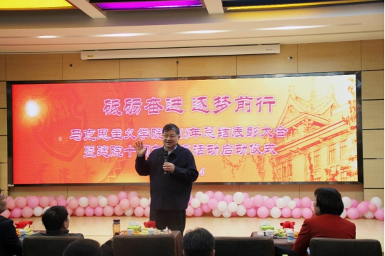 本站讯(通讯员 王琰 王璐)1月4日,马克思主义学院2018年总结表彰大会暨建院十周年院庆活动启动仪式在卫津路校区教职工活动中心举行。校党委常委、党委宣传部部长贾启君,人文社科处处长张俊艳,教务处处长巩金龙,原社外学院党委书记陈士俊,图书馆党委书记张超英,马克思主义学院院长颜晓峰、党委书记徐斌与马克思主义学院师生60余人参加了活动。大家欢聚一堂,共庆新年,并为学院发展建设积极献计献策。
