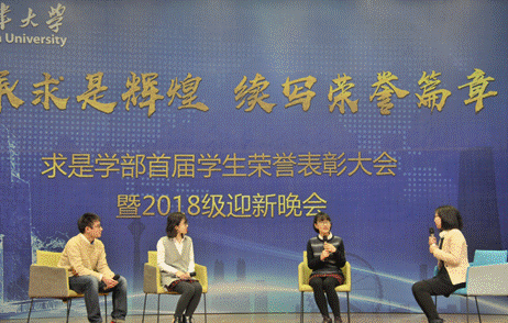 近几年来,求是学部共获国际奖341项,国家级奖226项,其中具有代表性的包括国际生物分子设计大赛金奖、国际基因工程机器设计大赛(iGEM)金奖、北美数学建模大赛一等奖、世界青年工程师大赛第一名、全国节能减排大赛特等奖、中国大学生船舶与海洋工程设计大赛一等奖、全国大学生数学竞赛一等奖第一名、全国数学建模竞赛一等奖、全国大学生英语演讲比赛特等奖等奖项。为更好地挖掘学生中的先进典型,充分发挥“典型引路、榜样示范”的作用,辅导员刘玥对陈昕雨、王溪和尹诗羽同学展开现场访谈。访谈中,三位同学分享了自己在竞赛中的宝贵经历和学习心得,并寄语学弟学妹们,要早日确立好人生目标,要保持一颗好奇心,驱使自己不断尝试新事物,决定做一件事就要坚持不懈。