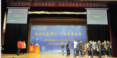 本站讯(通讯员 游莅荟 王湘晗)2018年12月28日,求是学部“传承求是辉煌,续写荣誉篇章”首届学生荣誉表彰大会在大通学生中心报告厅举办,求是学部党委书记单小麟,副主任于倩、王玮出席大会,学部组织员、辅导员、教务员及在2018年度各项评奖评优中获奖的优秀学生个人和集体代表参会,2017级和2018级全体本科学生观礼。