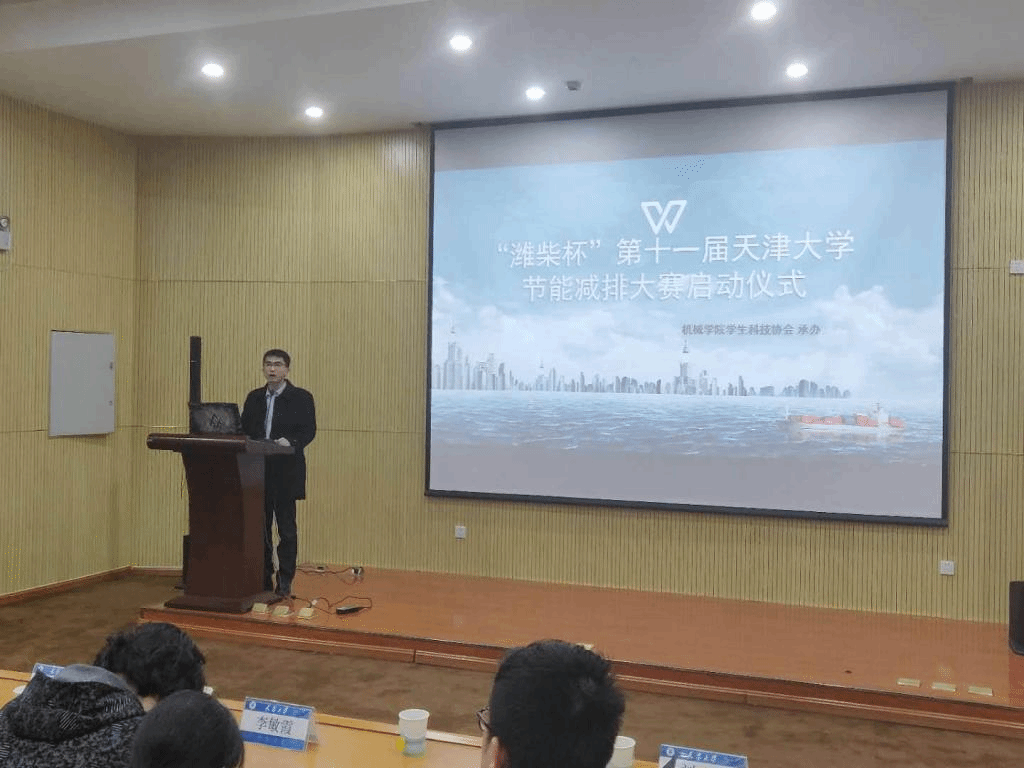 本站讯(通讯员 张利民 摄影 李苏泽 )12月18日下午,“潍柴杯”第十一届天津大学节能减排大赛启动仪式在北洋园34教学楼一层报告厅举行。本次大赛的赞助方潍柴动力人力资源开发中心常务副主任李成刚,人力资源开发中心副主任魏兆宗,人力资源开发中心管段人才管理经理韩蕾,人力资源开发中心校园招聘筑管王国伟,品牌管理部专题摄像主管刘亮,机械工程学院党委副书记刘岳,中低温热能高效利用教育部重点实验室主任赵军,机械工程学院教授张俊红、李敏霞和50名学生参加了启动仪式。