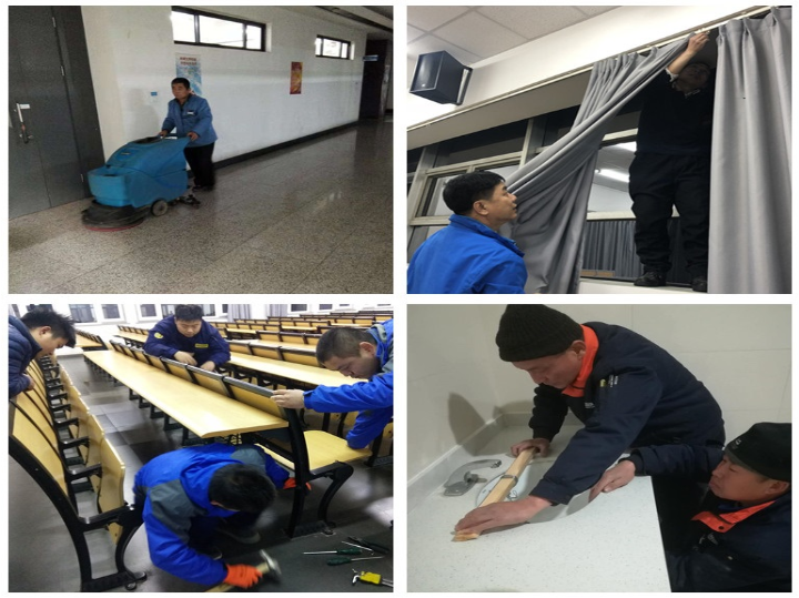 后勤保障部物业监管科管辖的考试楼宇包括23教、26教A区和西阶梯教室,共计考场229场,考生6702人次。物业方面根据要求制定详细的工作计划并进行明确分工,确保前期准备工作完善有序地进行。对辖区的考试楼宇进行设施设备检修和环境清洁工作:对教室灯管、空调、桌椅、窗帘、门窗、暖气和其他各类开关及线路进行了排查维修,保障考试期间设施设备的正常使用;对考场的桌椅、黑板、多媒体机柜、窗台、卫生间、楼梯间、地面等部位进行清洁,保障考场环境整洁;考试前一天安排工作人员对考试楼宇进行清楼、布置考务室、排查补充教室粉笔和板擦、张贴《考试守则》。