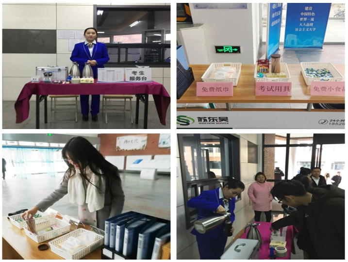 物业方面在楼宇大厅设置了考生服务台,为学生免费提供热水、纸巾、零食、橡皮擦、2B铅笔和中性笔等,让考生能够心情舒畅的进入考场,使紧张的情绪得到缓解;同时还为监考老师提供剪刀、胶带、订书机等办公用品;为师生及现场服务人员免费提供热水和姜糖水抵御严寒,此外还配备应急药箱以备不时之需。一杯温热的姜糖水,不仅仅给同学们带去温暖,更寄托着物业服务人员对同学们赛出佳绩的美好祝愿。